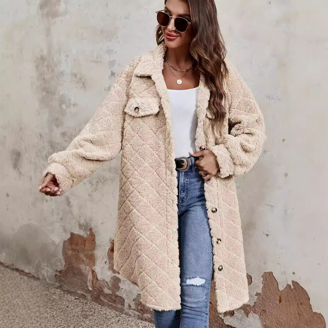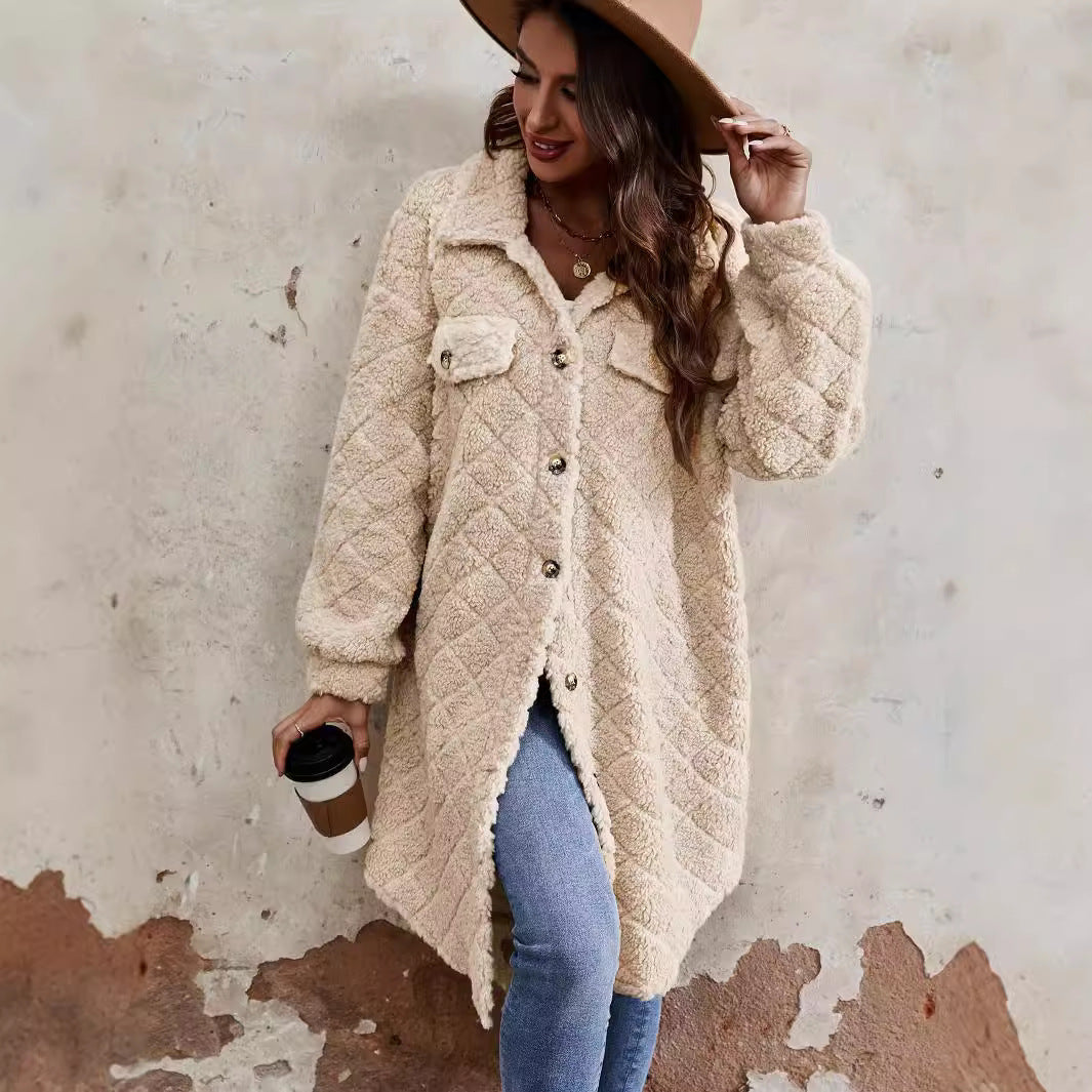 Women’s Fashion Plush Cardigan Coat – Soft Lapel Pocket Long Sleeve Jacket